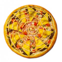 салями, пепперони, колбаски охотничьи, RANCH соус, перец халапеньо, сыр моцарелла, тесто