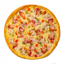ветчина, салями, бекон, помидоры , корнишоны, соус RANCH, сыр моцарелла, тесто